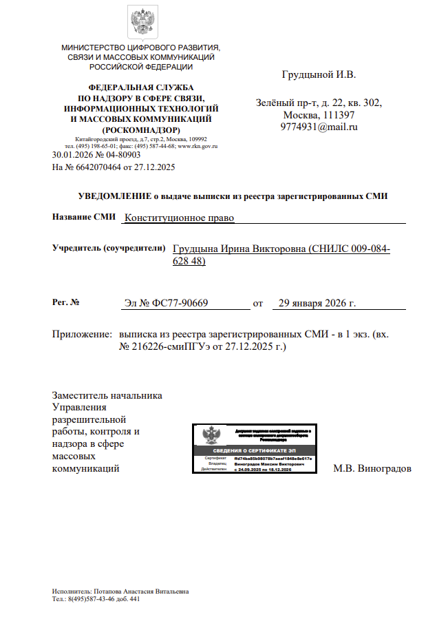 С 2026 г. научно-правовой журнал «Конституционное право» включен в Российский индекс научного цитирования (РИНЦ) и зарегистрирован в Научной электронной библиотеке eLIBRARY.RU.