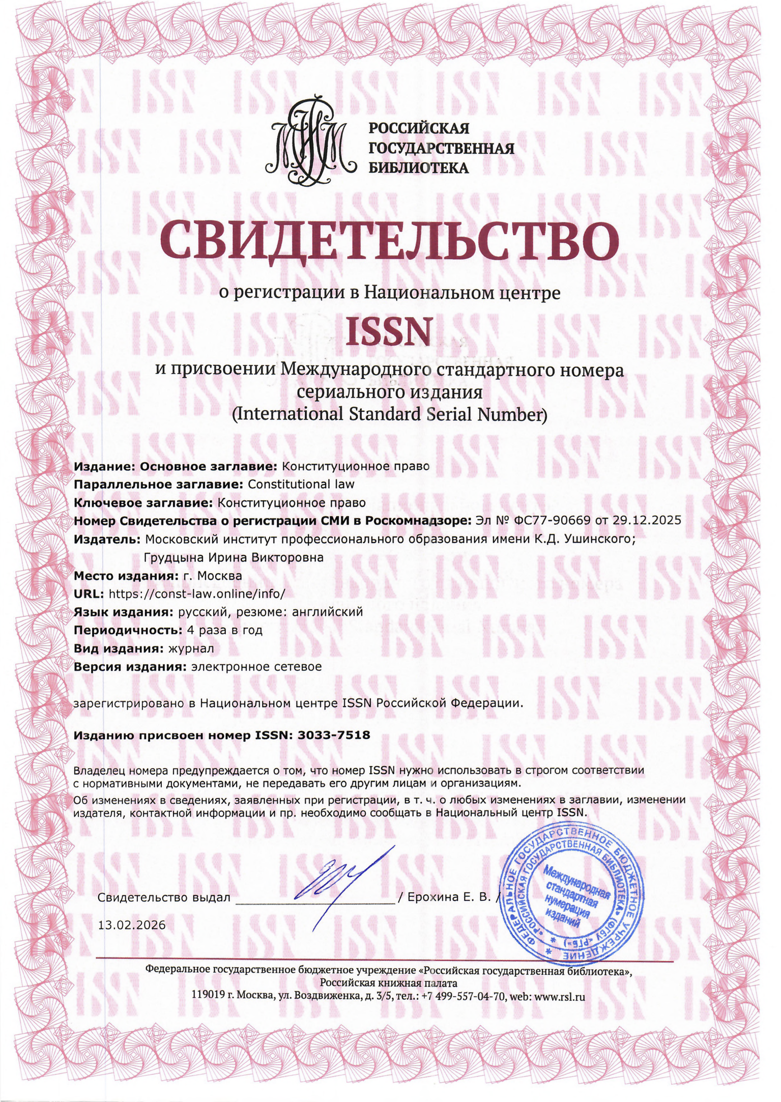 Since 2026, the scientific and legal journal «Constitutional Law» has been included in the Russian Scientific Citation Index (RSCI) and registered in the Scientific Electronic Library eLIBRARY.RU.
